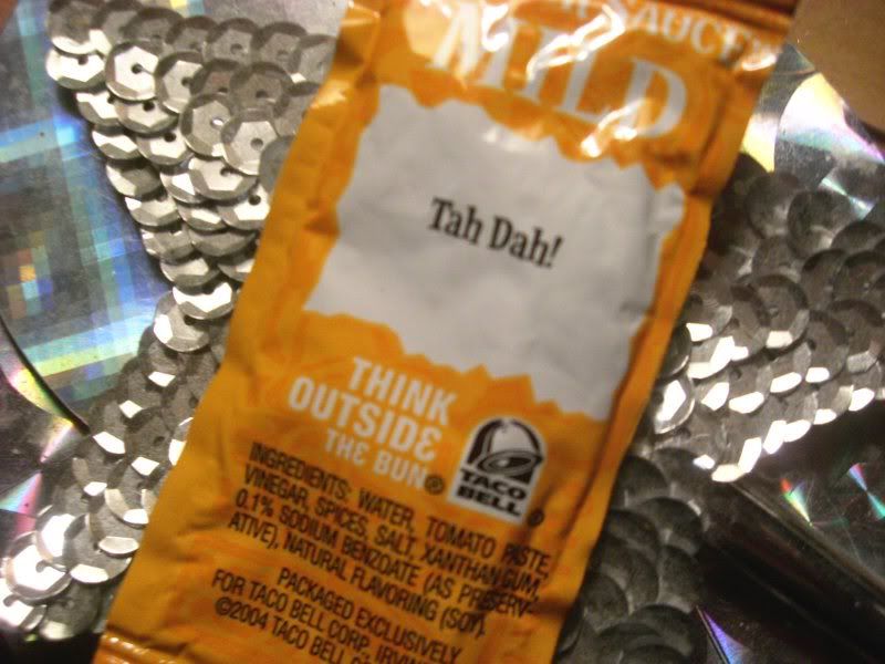Afterwards, life went on, me and my mom went out to get the family food, and I was the person who got taco bell. I got home, and pulled out two mild sauce packets and they BOTH said, "tah dah"