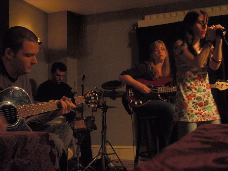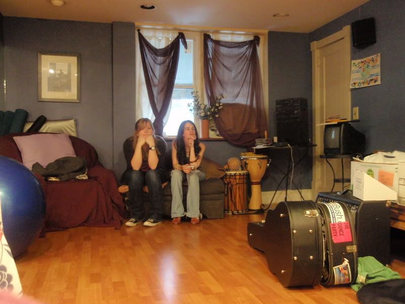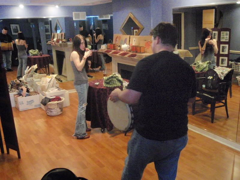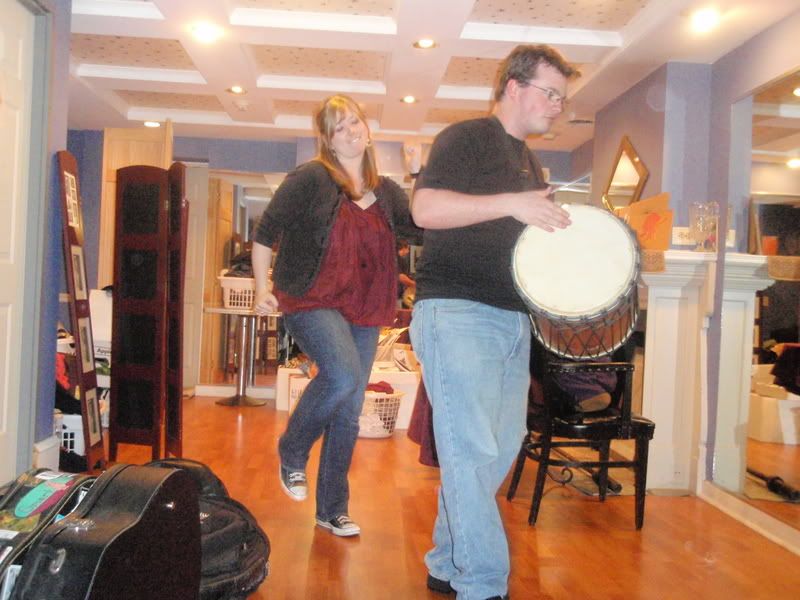 Last night J&theY had a show at the Hinge Cafe in Philadelphia. What was really important to know about this is it was our first experience with a dressing room/green room!There was a lot to occupy our time. Exercise balls, karaoke machines, ballet and such. But an important activity: The Nathan Parade in which Nathan walks around playing a drum and you march behind him.