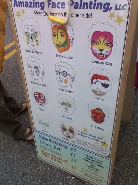 We all got our faces painted. (or not). Nathan got Harry Potter, Jenell got the worm, Lisa got Glamour Girl and I got Peacock. (or not.)